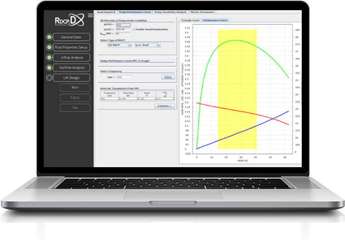 The cylindrical rotary displacement pump RDCP is composed of several stages. Each stage has a stator and a rotor. The rotor is the only moving part inside the pump due to the rotational movement of the shaft, which is connected to the motor. It represents an excellent alternative to produce fluids with high viscosity, from great depths and with high efficiency. The RDCPD is a computational application developed for designing an RDCP system. The app was specially developed to consider the fluid properties, the inflow and outflow analysis. Considering that the RDCP system is very sensitive to viscosity, the fluid properties setup module was specially designed and structured. The design module permits to calculate the pump performance curve for head and power, at different flow rates values. Also, it considers others security factors which together with a viscosity sensitivity analysis can be predict an optimum number of stages, with the corresponding power consumption, efficiency, and certain electrical parameters many times required for clients. A tornado curve is also included in this software. As a result of a simulation, a general report is generated for the software.
